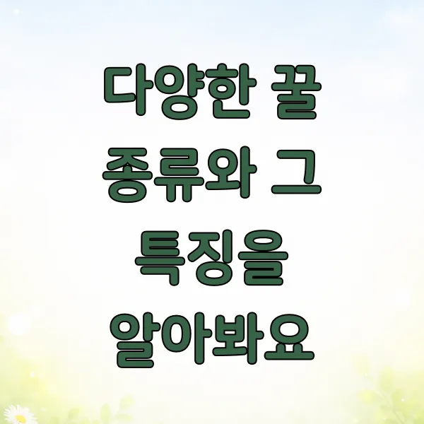 우리가 흔히 접하는 꿀은 아카시아꿀, 밤꿀, 잡화꿀 등 꽃의 종류에 따라 다양한 맛과 향, 색깔을 지녀요. 아카시아꿀은 부드러운 맛으로, 밤꿀은 쌉싸름한 맛으로 각기 다른 매력을 가지고 있답니다.